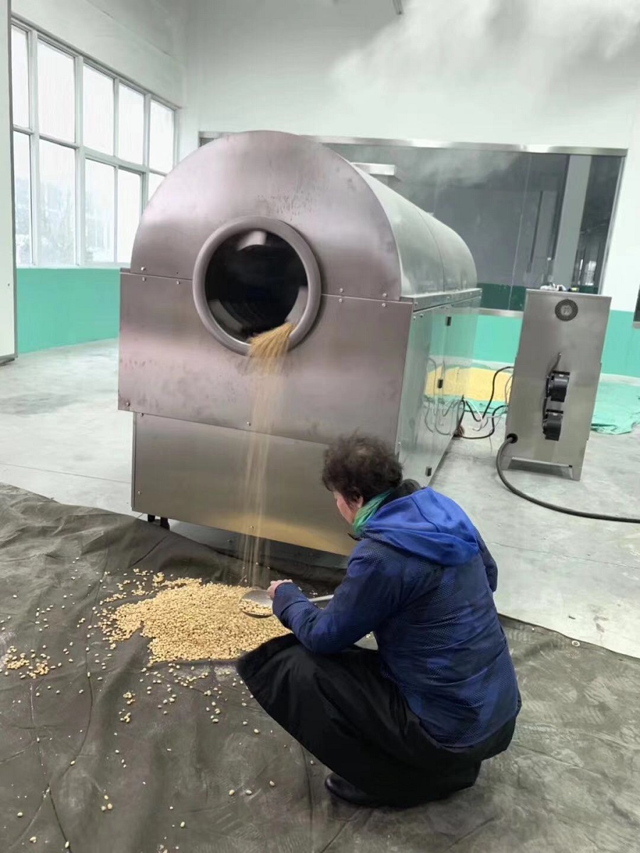 新疆知名炒货厂卢总试机我们许昌智工定制款不吐盐自动分离的电磁炒货机,炒制泡好的黄豆来看效果,色泽味道棒棒哒。
